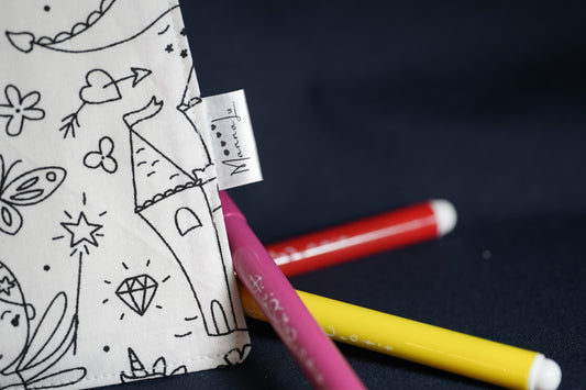 Des cahiers à colorier à emmener partout (voyages, resto, salles d'attente...), des sets de table pour la maison ou à transporter partout et surtout au resto dans une trousse elle-même coloriable. Mais aussi des sacs (à trésors, à doudou, pour la crèche, l'école...) et des protège-cahiers pour toujours plus de couleurs partout !
